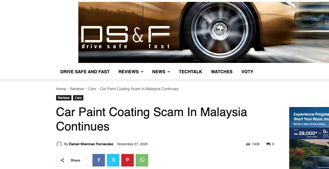 !DSF.my article titled Car Paint Coating Scam In Malaysia Continues Figure: DSF.my's coverage of the car paint coating scam problem in Malaysia. The article documents how consumers are misled by sub-standard applications.