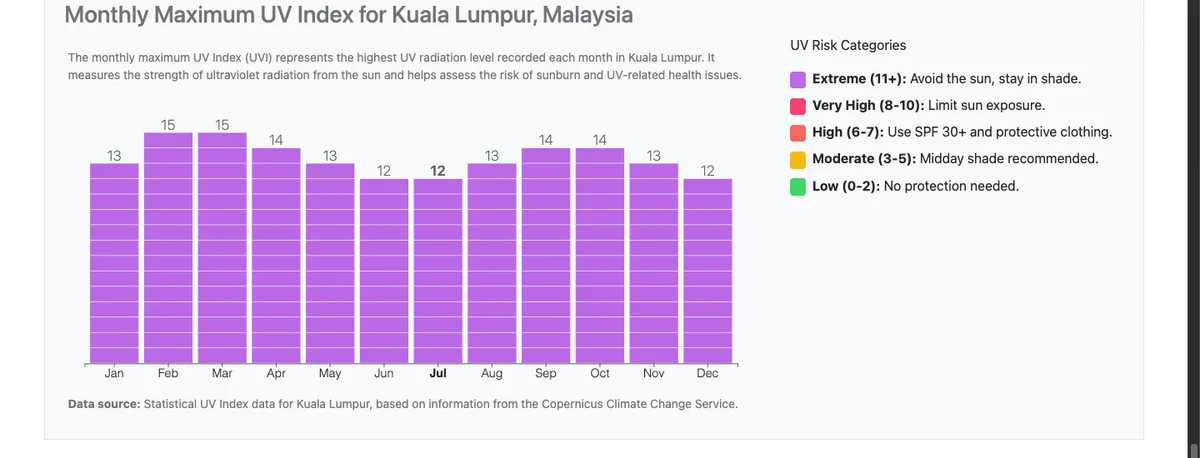 The chart below shows monthly maximum UV Index values for Kuala Lumpur, sourced from the Copernicus Climate Change Service. Every single month exceeds the WHO "extreme" threshold.